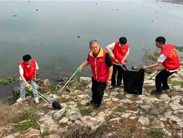 在高新区滨水公园,志愿者手持垃圾袋、垃圾夹等工具分工协作,重点清理河岸垃圾,以“志愿红”守护“生态绿”。